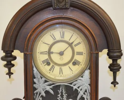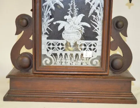 With a T&S movement; a paper dial marked "A"; a decorated glass door and a nickel target pendulum. The clock is running and striking at this time. (Th...