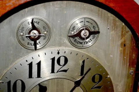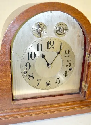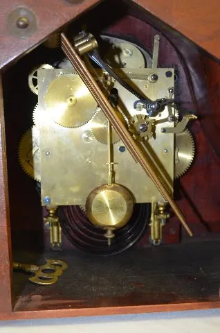 It has a marked 8 day T&S movement with chime, 5 rod strike and a gold colored face with a marked chapter ring dial. In a cherry wood case. The key an...