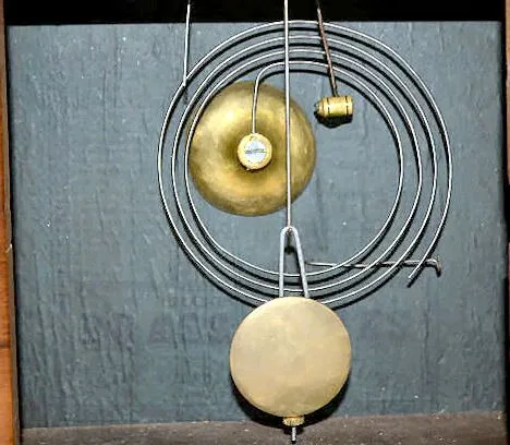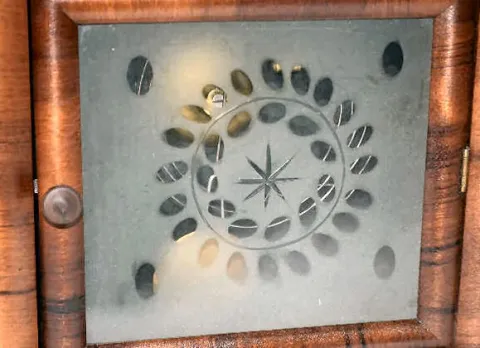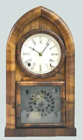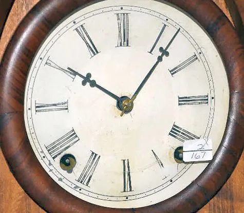 With an 8 day T&S movement marked E.N. Welch; an unmarked painted tin dial; a darkened interior label; the pendulum and key. The clock is running and ...