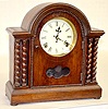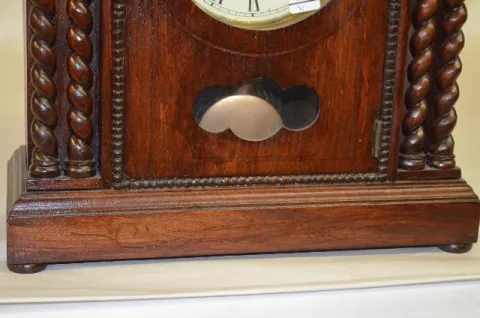 With an 8 day T&S movement and a marked paper dial. In a nice wood cabinet with twisted columns and beaded trim work. Has the pendulum and key with it...