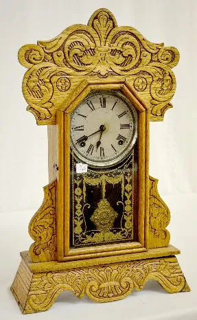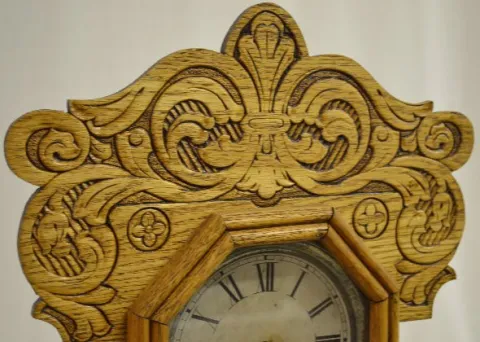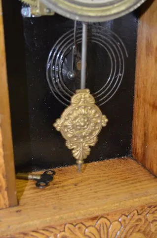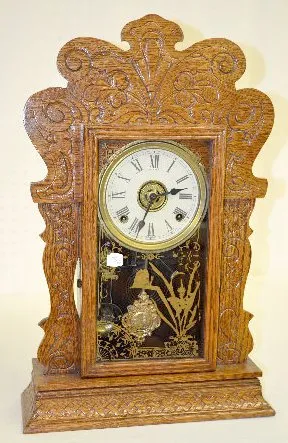 1.) With an 8 day T&S movement and a marked "Made in U.S.A." paper dial. The stenciled door has vining morning glories and lace swag. There is a leaf ...