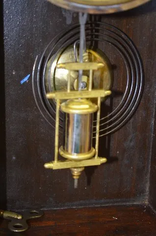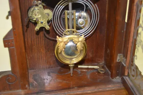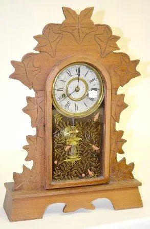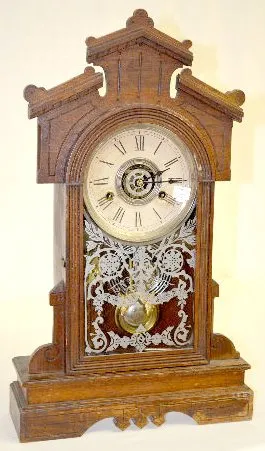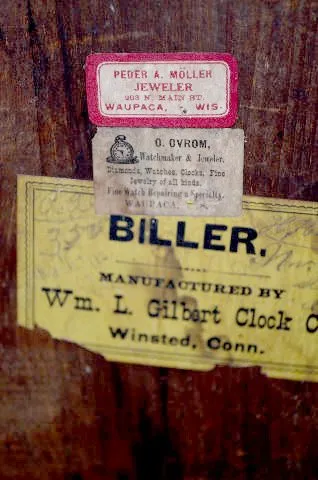 Gilbert Walnut "Biller" Kitchen Clock with an 8 day T&S with alarm movement, an unmarked paper dial and a nickel pan. The stenciled glass door has mul...