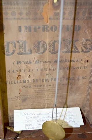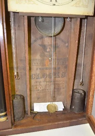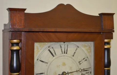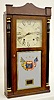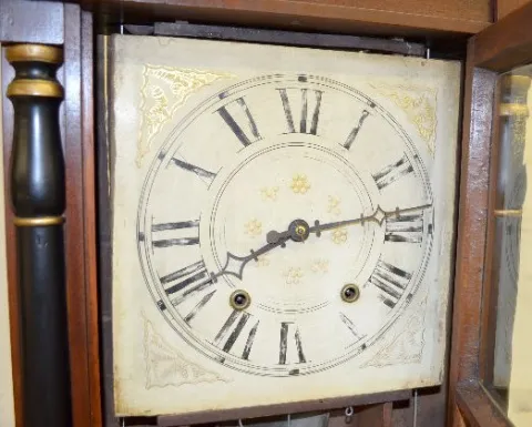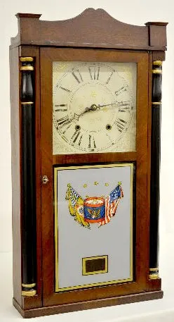 With a 2 weight T&S wood movement and a painted wood dial. The 1/2 column wood case has reverse painted glass with a drum and flags on it. There is a ...