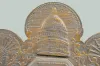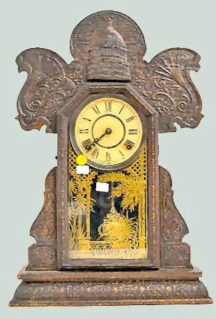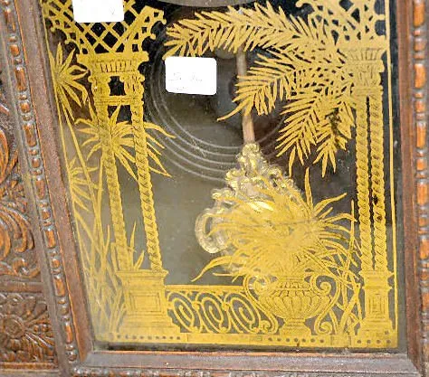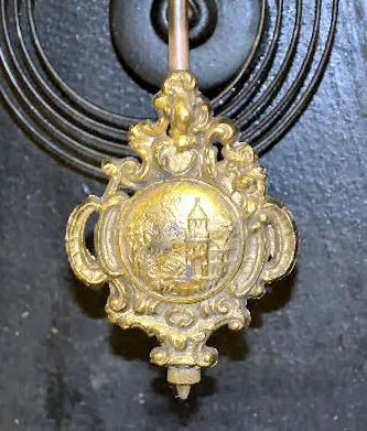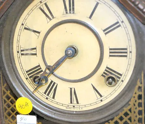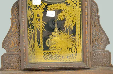 With an 8 day T&S movement; a paper dial marked, "Made in U.S.A."; the pendulum and an Ingraham paper label with directions on the back of the case. T...