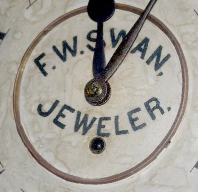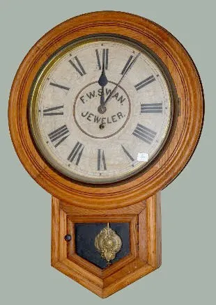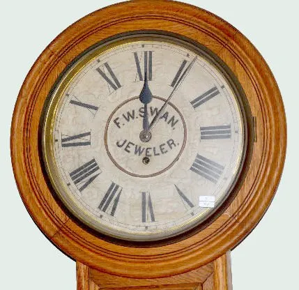 With a TO movement; a paper dial advertising "F.W. Swan, Jeweler" and the pendulum. Not tested. (The dial has darkened.) 25" Tall...