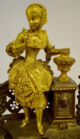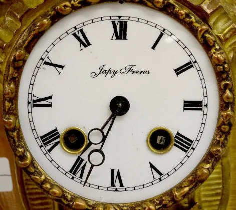 With a T&S movement marked "Vincenti" and "Duplan & Salles par a Paris 070" and a paper and plastic dial marked "Japy Freres". In a bronze filigreed c...