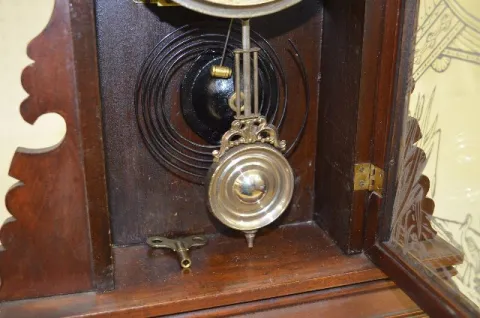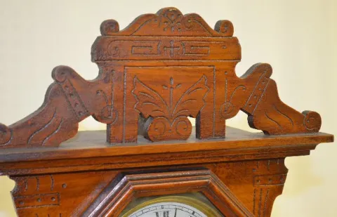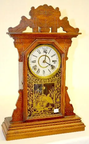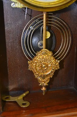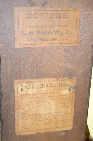 1.) E.N. Welch Walnut "Cowper" Kitchen Clock with an 8 day T&S movement, an unmarked painted dial and a brass pan with a sunburst pendulum. The stenci...