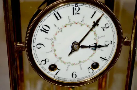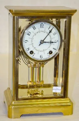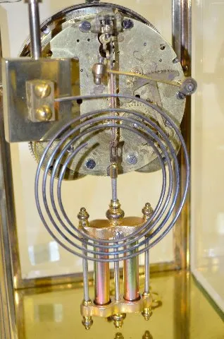 With 1/2 hour strike on a gong, a floral decorated dial and a simulated mercury pendulum. In a brass and beveled glass case. The clock is running and ...