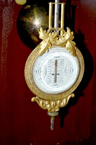 With an 8 day T&S movement, an unmarked paper dial and a brass pan. The glass is stenciled with a stone floor, papered walls and a draped opening. The...
