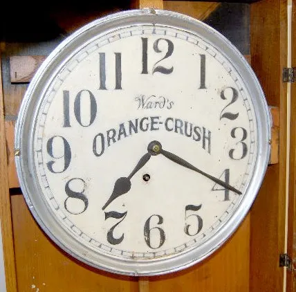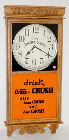 With an 8 day TO movement and an original Orange Crush advertising dial. The solid oak case, with pressed designs, is also advertising Orange Crush. N...