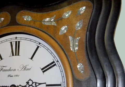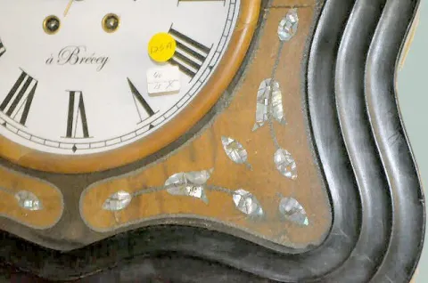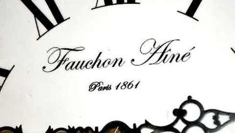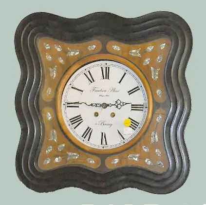 With an 8 day T&S movement; a simulated newer porcelain dial marked "Fauchon Aine Paris 1861 a Brecey" and the pendulum. Not tested. (The wood is crac...