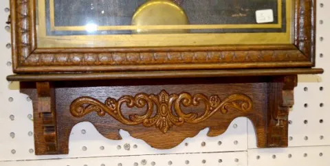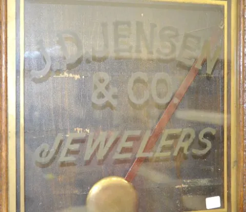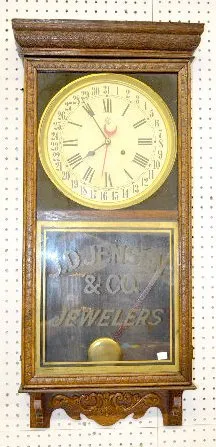 With a T&S movement; a paper calendar dial marked "Waterbury" and a lower glass advertising "J.D. Jensen & Co. Jewelers". The pendulum is with the clo...