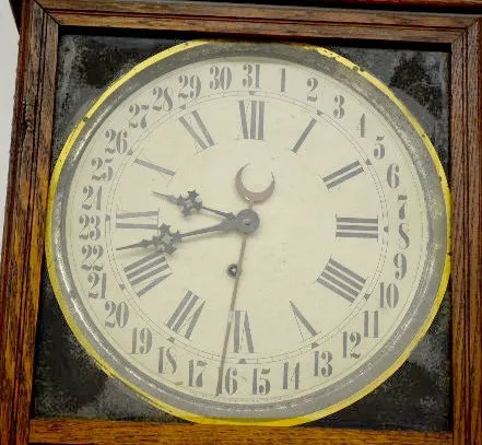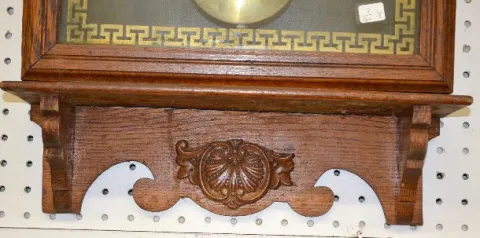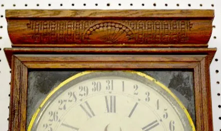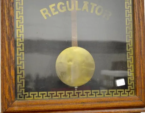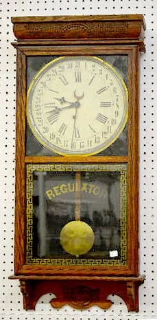 With a TO movement; a paper calendar dial marked "Ingraham"; "Regulator" stenciled lower door; the pendulum and key. Not tested. (The flat bottom boar...