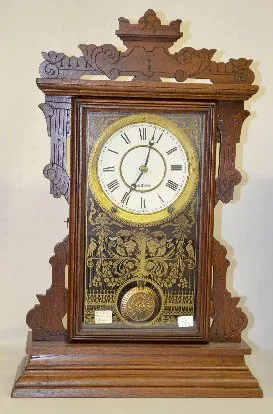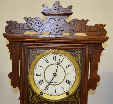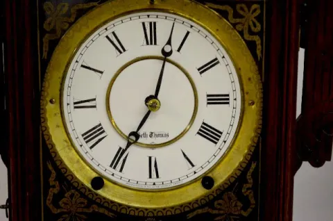 With a T&S movement; a paper dial marked "Seth Thomas"; a decorated door; the pendulum and key. The clock is running and striking at this time. (The d...