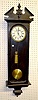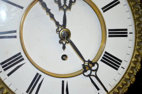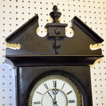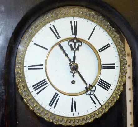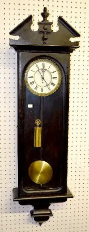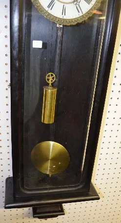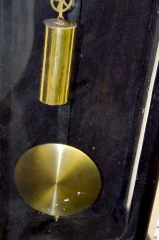 With a porcelain dial; an ornate brass bezel; brass weight and bob. Not tested. (The black case has some restoration. The weight has some dents. The b...