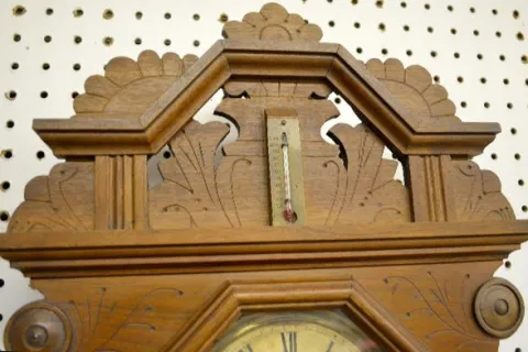 In an walnut case with a T&S with alarm movement; an unmarked paper dial; a partial paper label on the back; the pendulum, thermometer and level. Not ...