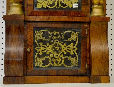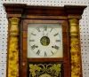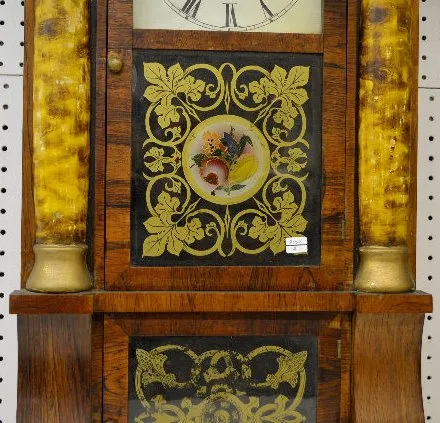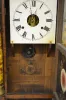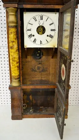 T & S; unmarked painted metal dial; has pendulum and key; partial paper label; painted inside the door. (Paint flaking on the door.)...
