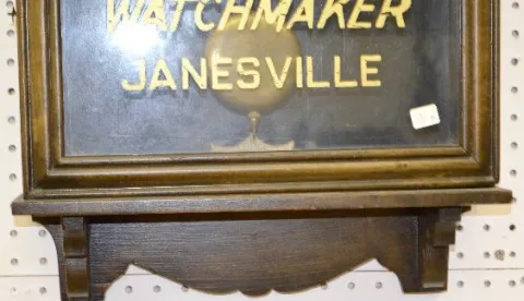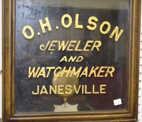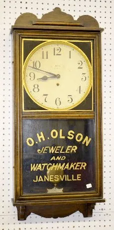 With a TO movement; a paper dial marked "Waterbury"; a "Waterbury" tag inside the case; and the pendulum. The lower glass reads "O.H. Olson Jeweler an...