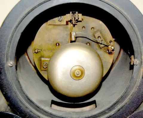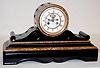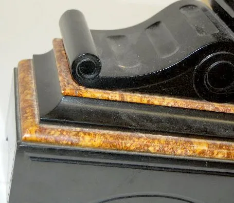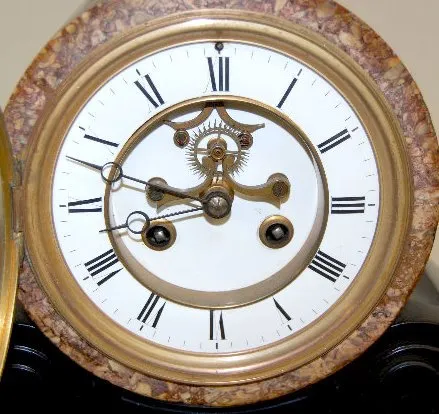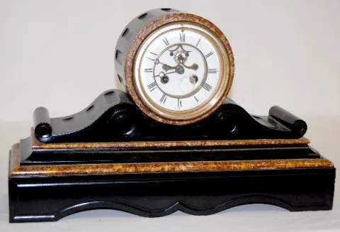 With bell strike m movement, No. 237 and a porcelain dial with visible escapement. The tambour style slate case has speckled brown marble trim. (The c...