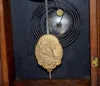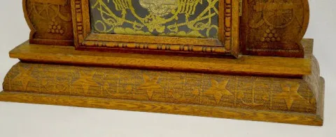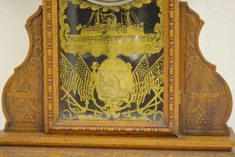 In an oak case with an 8 day T&S with alarm movement; a marked Ansonia Clock Co. paper dial and an American eagle pendulum. (The clock winds and strik...