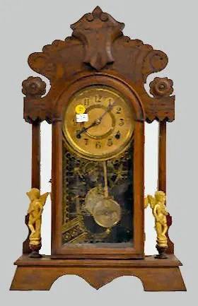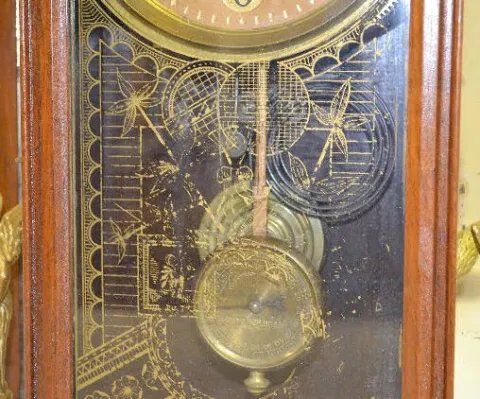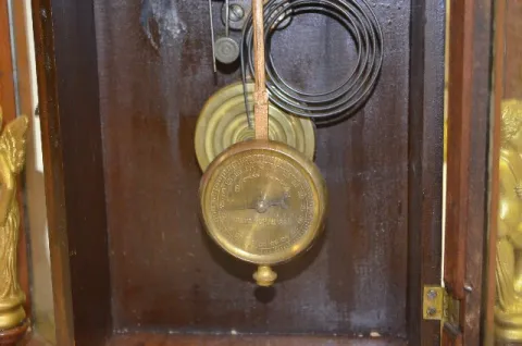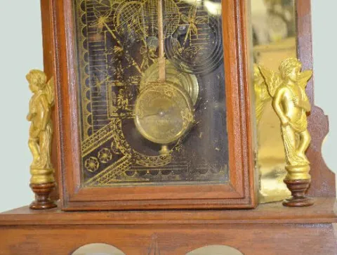 With an 8 day T&S movement; an unmarked paper dial; mirror sides with statues and the pendulum. Unmarked brass movement; clock appears all original. T...