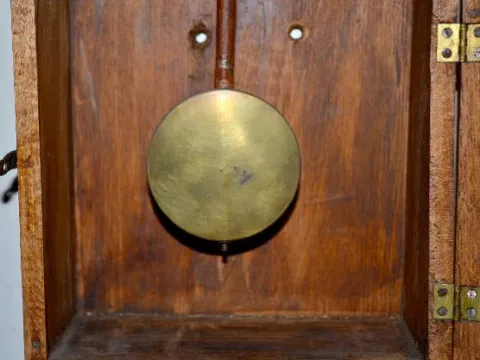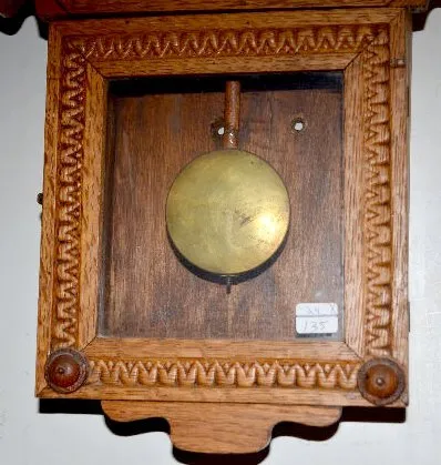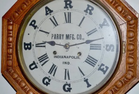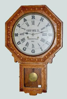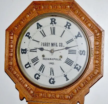 8 day T & S; painted metal dial with "Parry MFG. Co. Indianapolis, IND." In the center and "Parry Buggies" around the dial; has pendulum; pressed oak ...