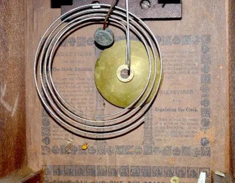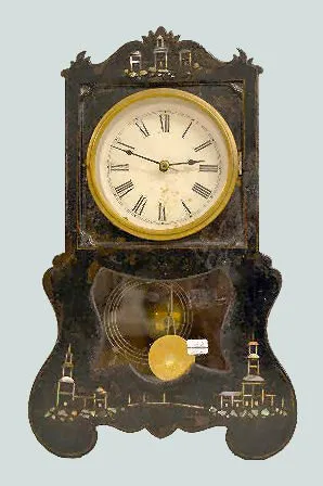 The iron front case, made by Upson Bros., is with an 8 day T&S Morse No. 1 brass movement; an unmarked paper dial and the pendulum. Circa 1850's. The ...