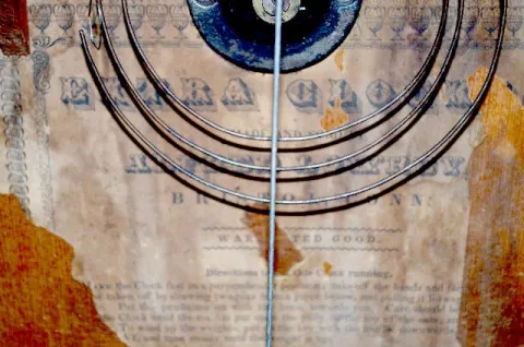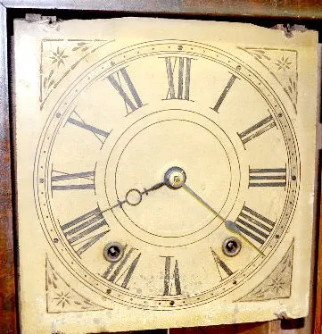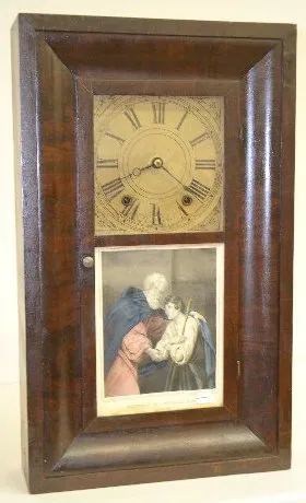 With a T&S wooden works movement and a paper on wood dial. The mahogany veneer case has a paper print of the Prodigal Son in the lower door. There is ...