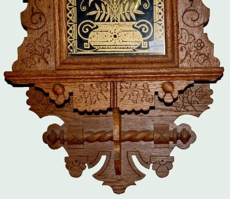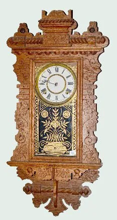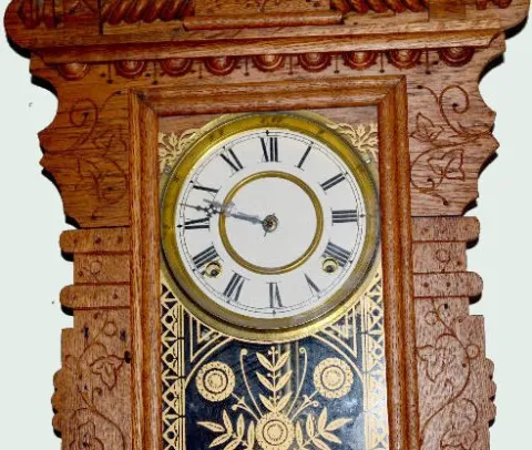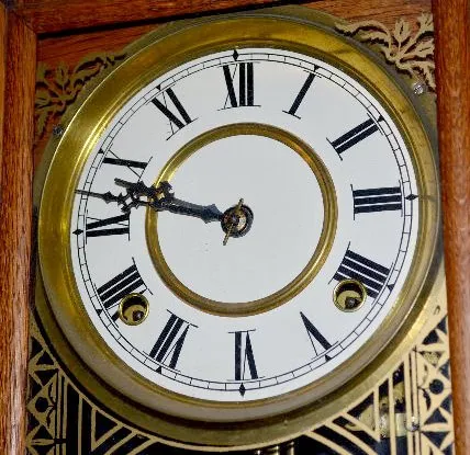 In an oak case with an 8 day T&S movement; an unmarked paper dial; a Waterbury label on the back and a Waterbury pendulum. Not tested. (The dial may h...
