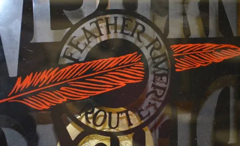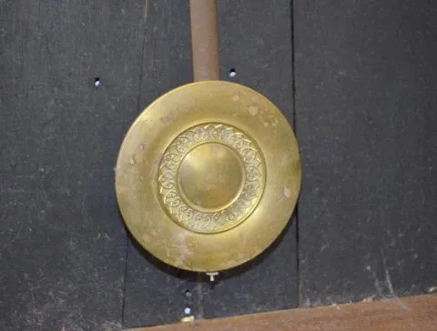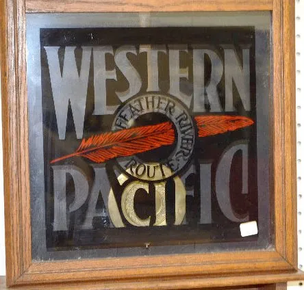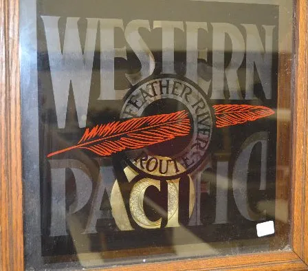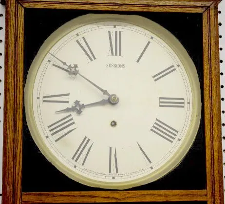 With a TO movement; a paper dial marked "Sessions" and a lower door advertising "Western Pacific Feather River Route". The pendulum is with the clock....