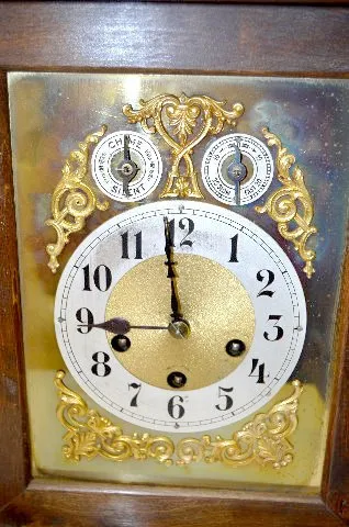 In a carved case with a T&S with chimes movement marked "Junghans"; a brass face with a silvered metal chapter ring dial and the pendulum. The clock i...