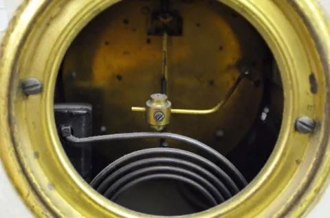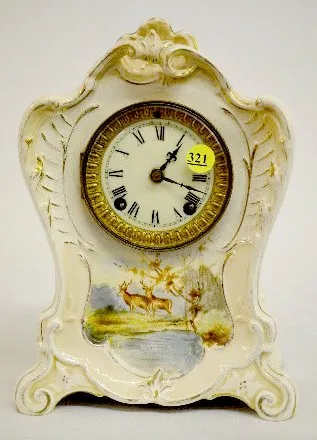 Ansonia T & S; unmarked porcelain dial; has pendulum and key; signed movement; marked case; cream colored case with buck and doe scene. Not tested. 1...