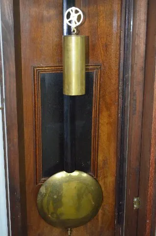 With a 2 piece porcelain dial, brass trim, pendulum and weights. Not tested. (There are some scuffs and worm holes to the case.) 47" Long...