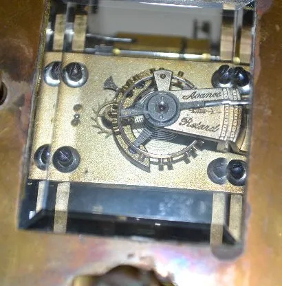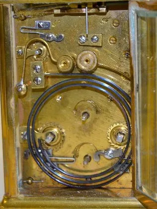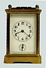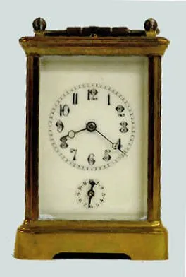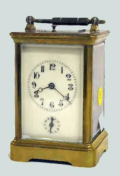 In a "Corniche" style case with a visual top and beveled glass; an unmarked porcelain dial with alarm bit and an unmarked movement. Not tested. (There...