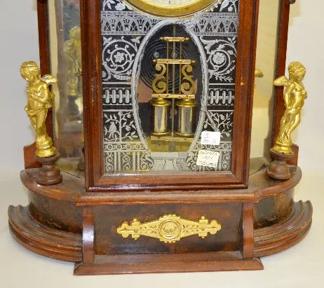 With a T&S movement; a paper dial marked "A"; a decorated glass door; bronze ornaments and gold painted cherubs. The pendulum and key are with the clo...