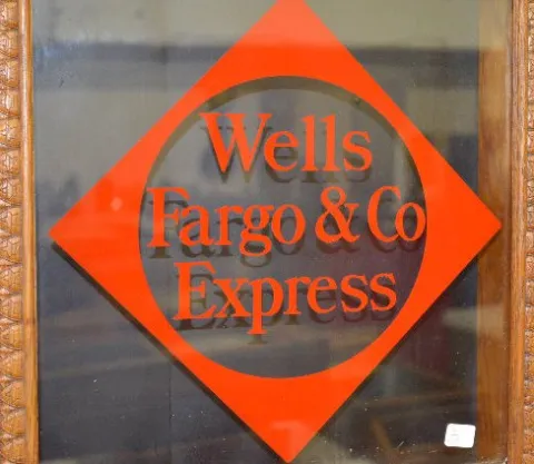 With a TO movement; a paper calendar dial marked "Sessions" and a lower glass advertising "Wells Fargo & Co. Express". Not tested. (The dial is staine...