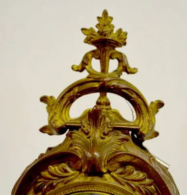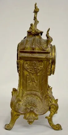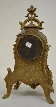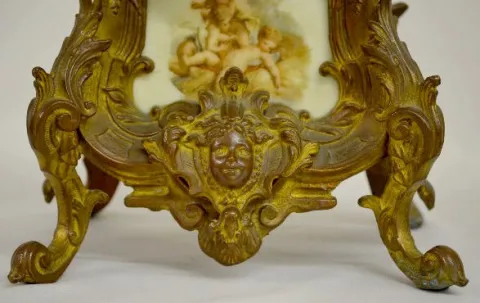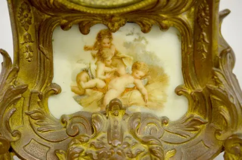 With a signed T&S movement; an unmarked porcelain dial and a porcelain panel of 3 cherubs playing. The clock is running and chiming at this time. (The...