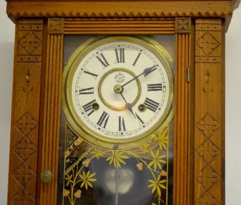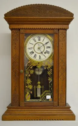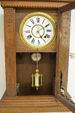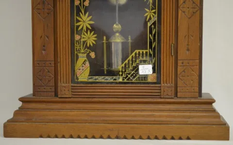 with a T&S movement; a paper dial marked "New Haven"; a decorated door; the pendulum and key. (The clock runs but does not strike.) 23 3/8" Tall...