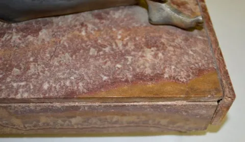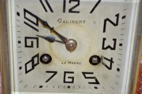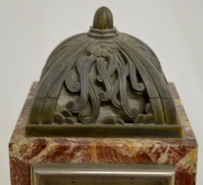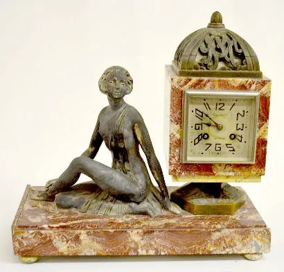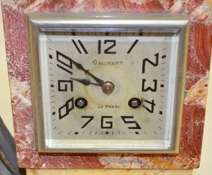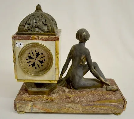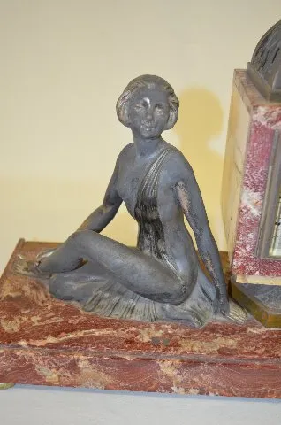 With a T&S movement numbered 13707 and a silvered metal dial marked "Galibert, LeHavre". The statue is an Art Nouveau lady seated on pink marble. Not ...