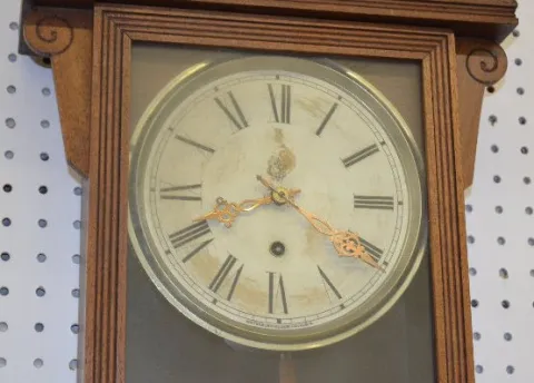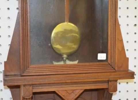 With a TO movement; a paper dial marked "WCC"; a "Waterbury" inside tag; a good label on the back; the pendulum and key. Not tested. 41 1/2" Long; 33"...