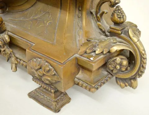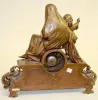 With hour and 1/2 hour strike on a cup bell. The white metal case has a porcelain dial in it. The case has a dark finish and the figures of Jesus as a...