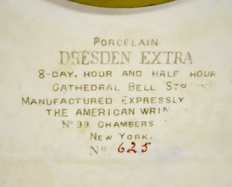 Marked in red on the back No. 625 along with other pertinent information. With an 8 day T&S, 1/2 hour gong strike and a paper dial. In a cobalt and go...