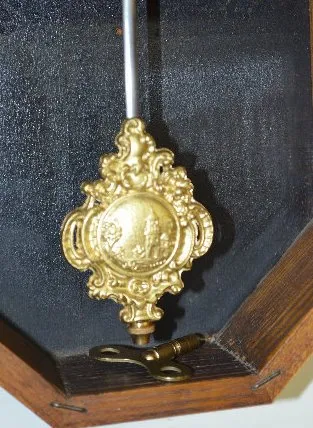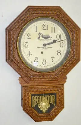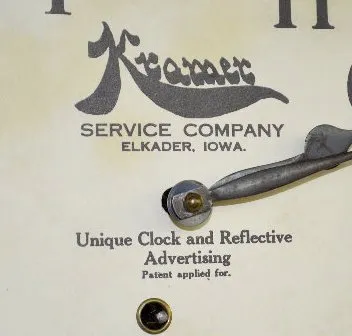 With a TO movement in a carved oak case with a reversed dial that reads "Kramer Service Company Elkader Iowa". Not tested. Dial 9" Diameter; Case - 22...
