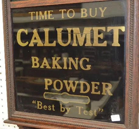 Sessions "Regulator H" Oak Adv. Calendar Clock: With a TO movement and an unmarked paper calendar dial. The lower door advertises "Time to Buy Calumet...