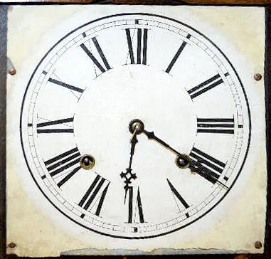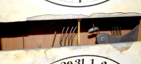 8 day with gong strike; double dials; in a walnut case with paper label; with the pendulum. Not tested. 25 1/2" Tall (There is minor damage on the cal...