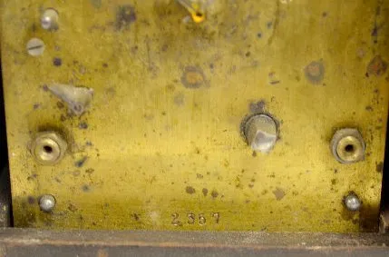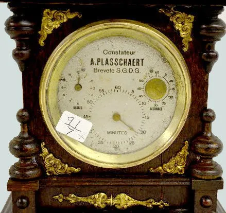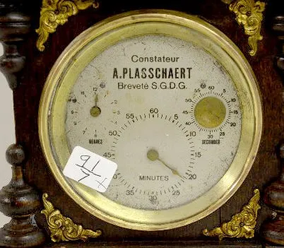 In a wood case with metal ornaments; a movement numbered 2357; one large dial marked "Constateur A. Plasschaert Brevete S.G.O.G." and 3 smaller dials ...