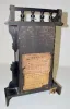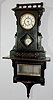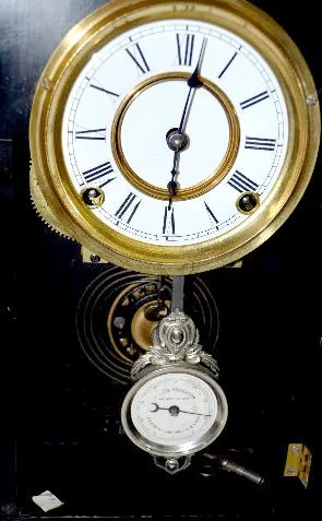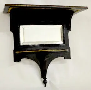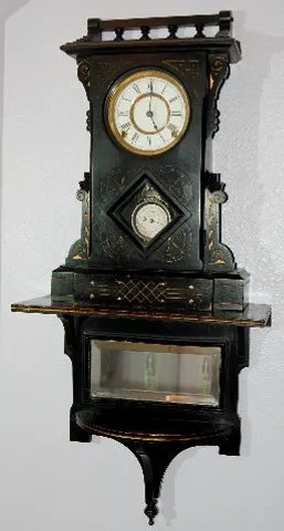 With an 8 day T&S movement; an unmarked porcelain dial; the pendulum and key. There is an ebonized clock shelf with a beveled mirror with the clock. T...