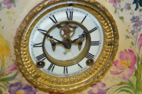In a green case with multi-color floral decorations and a marked "Ansonia" 8 day T&S movement; a marked porcelain dial with visible movement and the p...