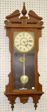 With a T&S movement; a paper dial marked "WCC"; a "Waterbury" tag inside the case; the pendulum and key. Not tested. 41" Long; 32 1/2" Long without th...