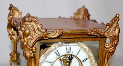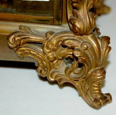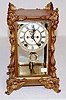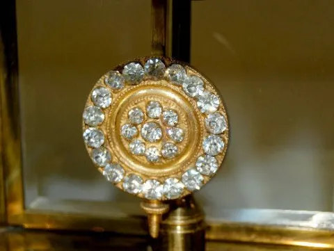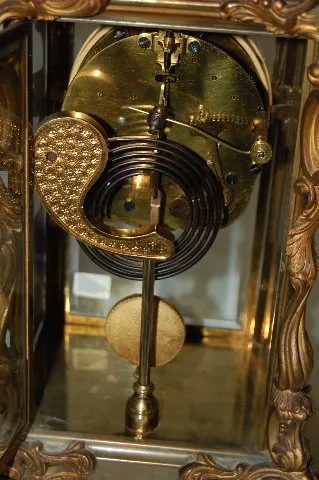 With jeweled sash and pendulum. In a plain metal case with a visible escapement dial. 8 Day Time with 1/2 hour gong strike. The clock is running and s...
